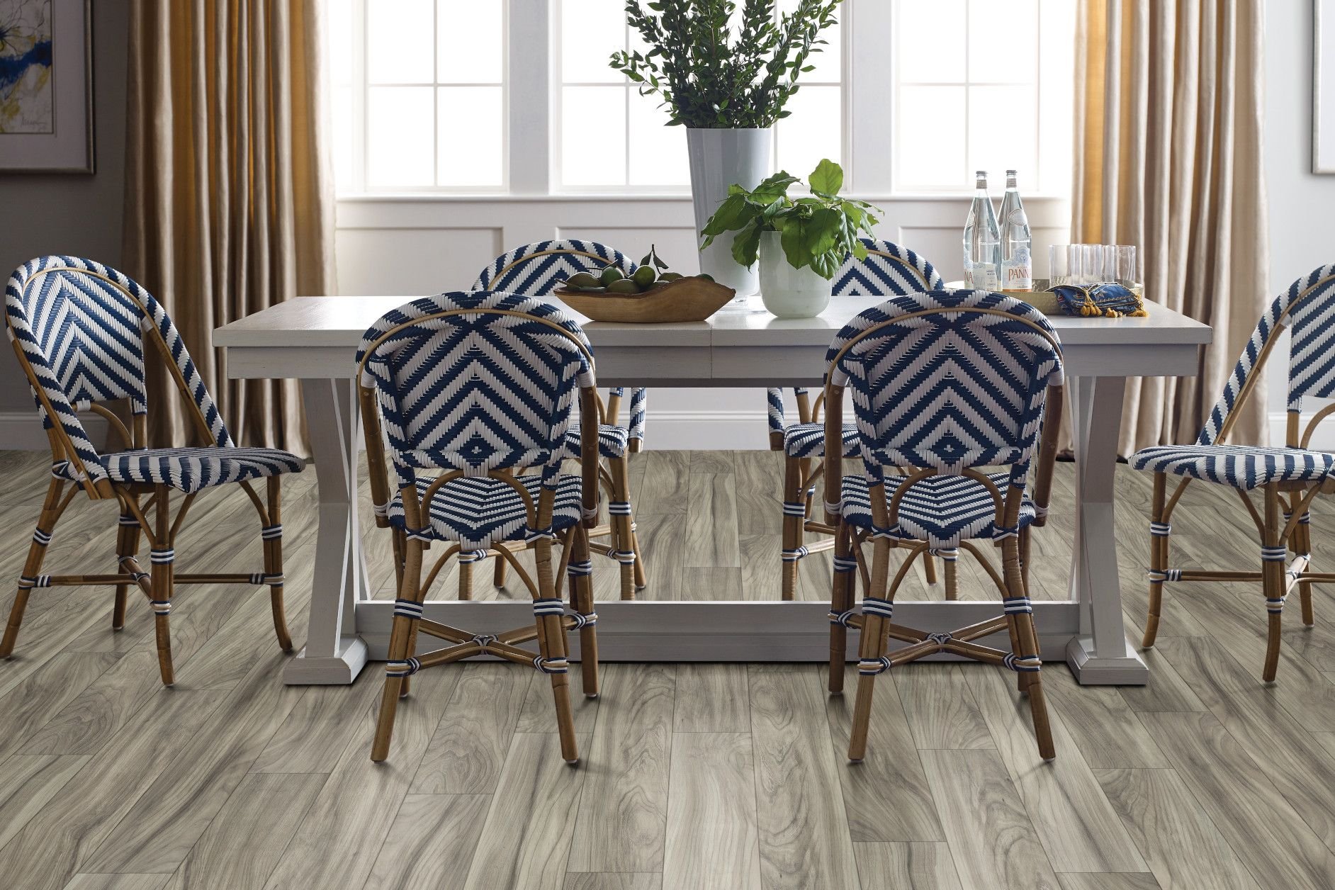 dining room with blue and white chairs